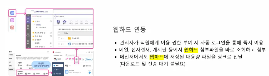 - 중앙 집중 관리: 모든 문서를 웹하드에 저장하고, 그룹웨어와 연동해 최신 버전을 자동으로 공유합니다.