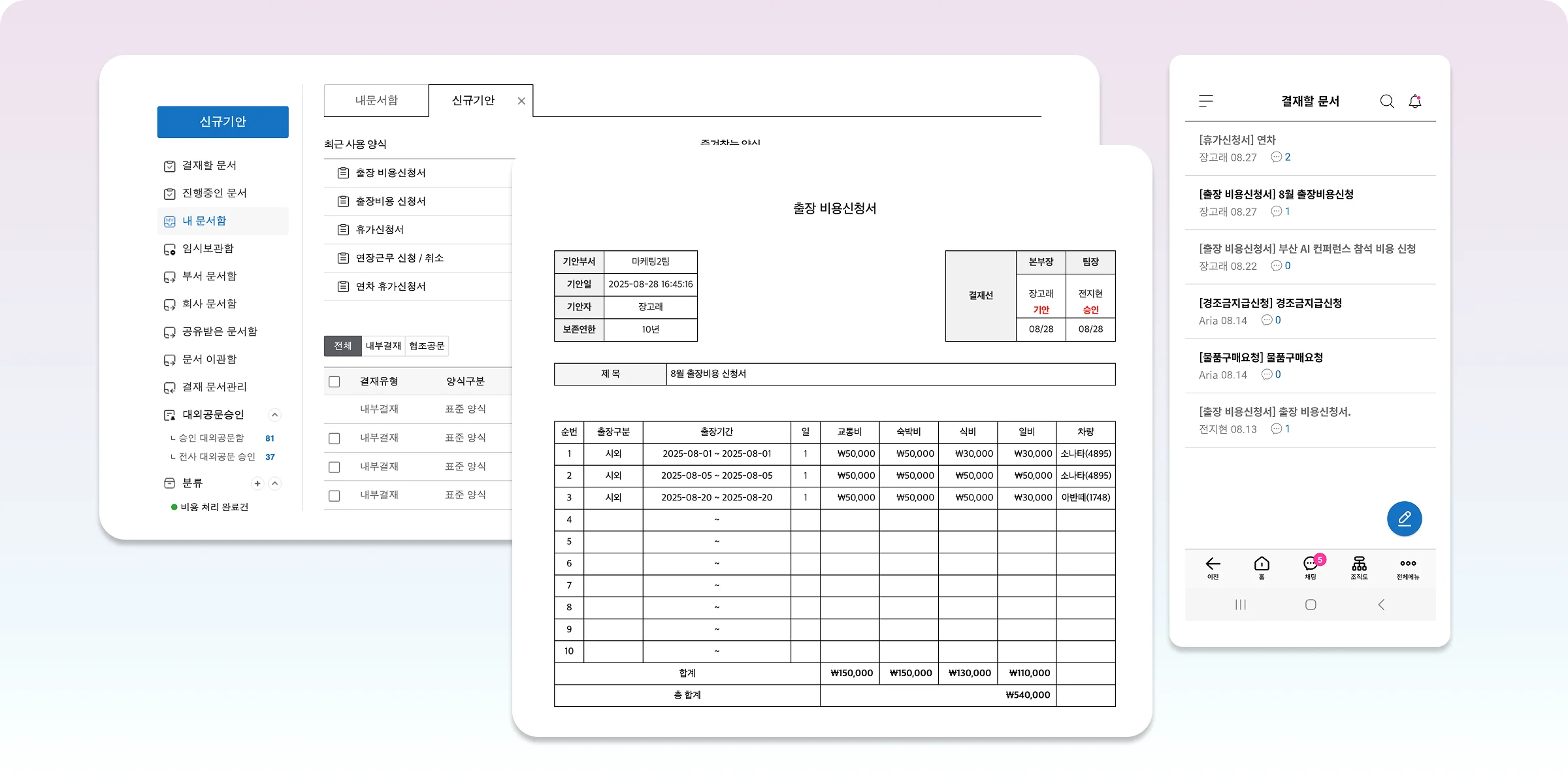 전자결재로 조직의 결재 흐름을 투명하게 만들고, 외근 중에도 승인할 수 있어 조직 전체의 반응 속도와 신뢰도를 높여줍니다.