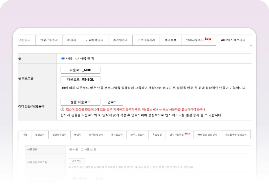 보안과 근태를 동시에 관리하고, 수기 입력이나 중복 등록 없이 정확하고 신뢰도 높은 근태 데이터를 운영할 수 있습니다. (ADT캡스, 에스원세콤 지원)
