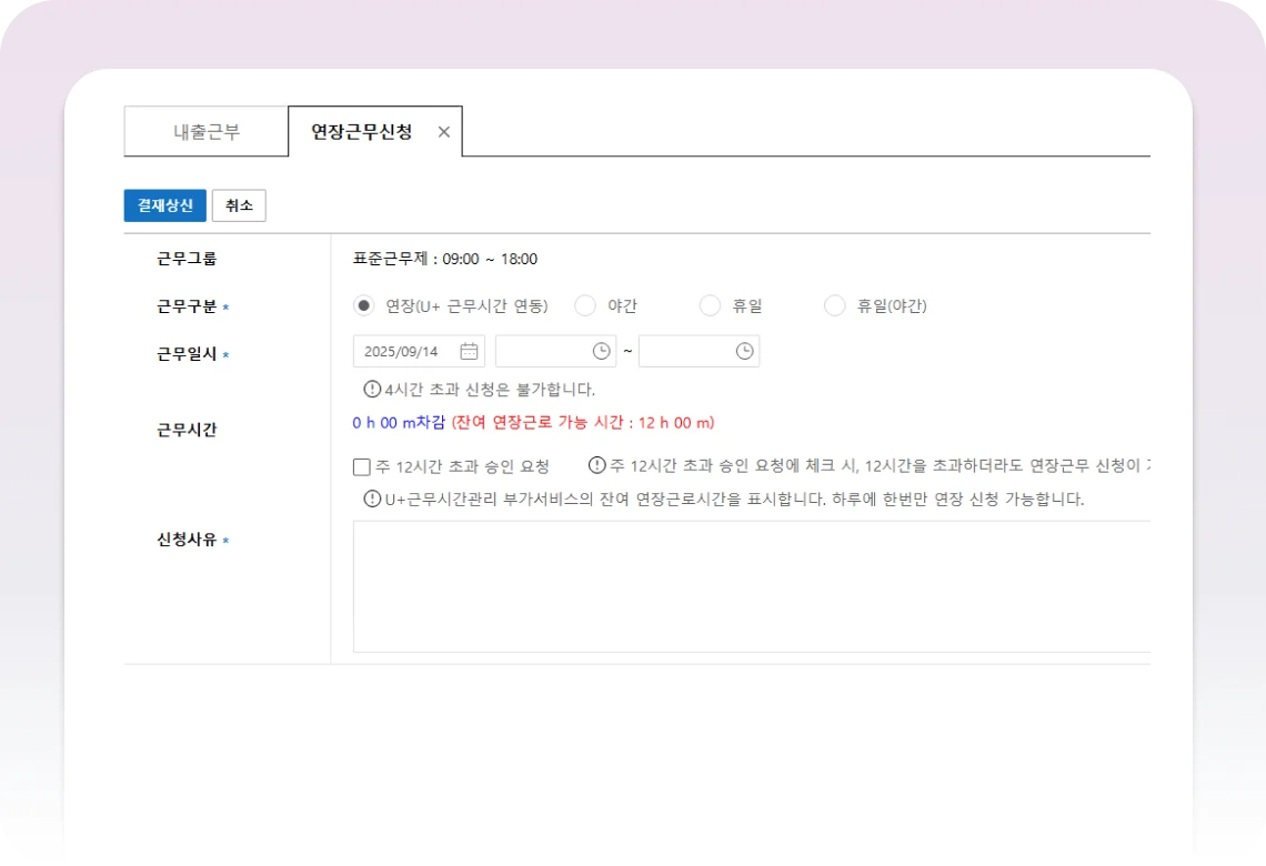 출퇴근 기록, 연장·휴가 신청, 근무시간 확인 등을