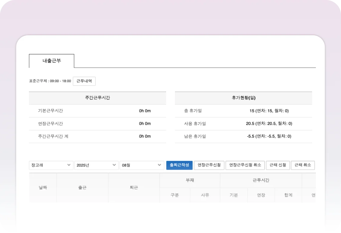 부서 단위의 실무 관리부터 전체 조직의 근태 통제까지 효율적이고 체계적인 관리가 가능합니다.