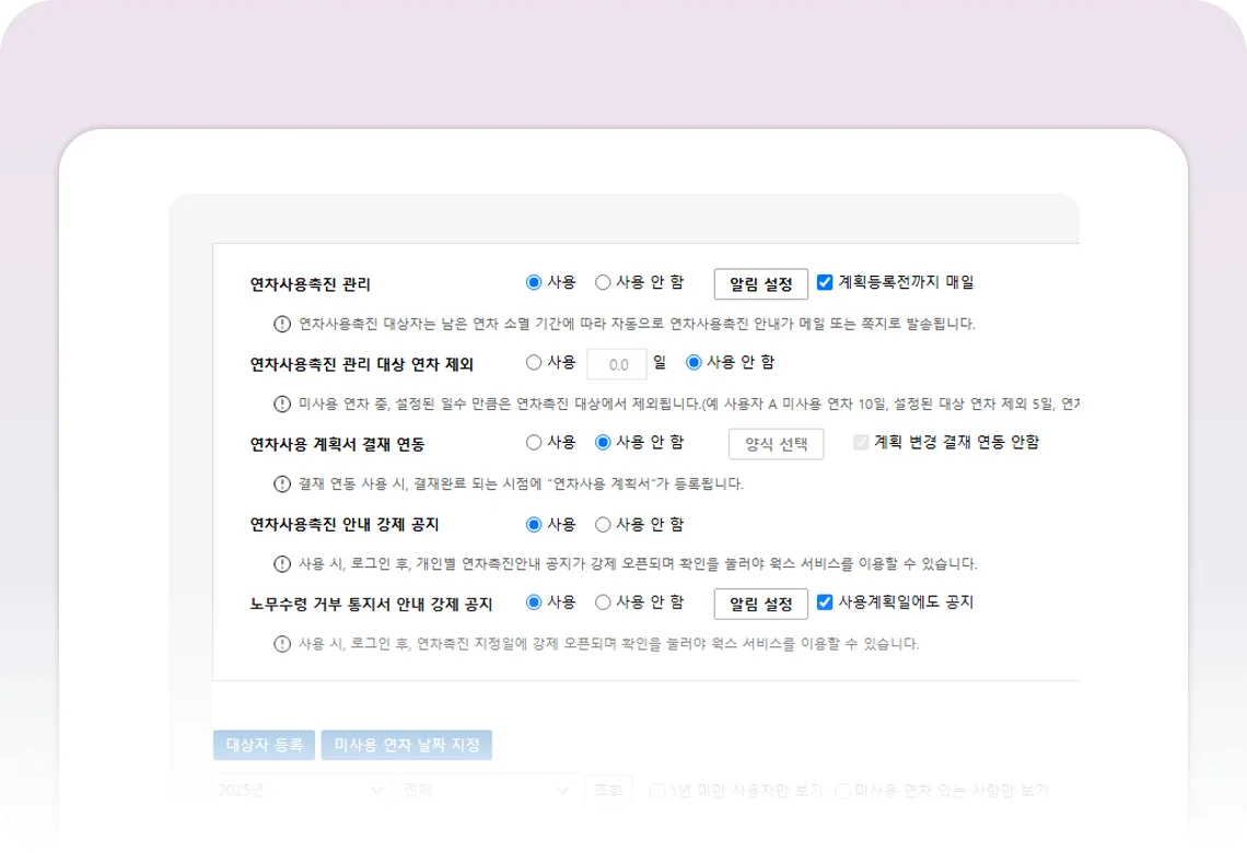 연차 촉진 절차 시행에 필요한 자동화 기능으로 법적 리스크를 최소화합니다.
