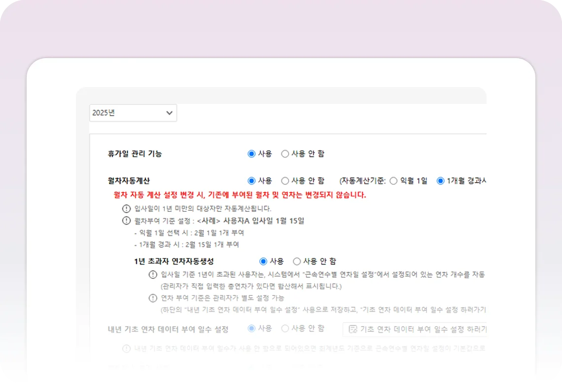 관리자가 기준값을 설정해 두면 근로기준법에 따른 복잡한 연차 발생 기준을 자동으로 계산하여 정확하게 부여합니다.