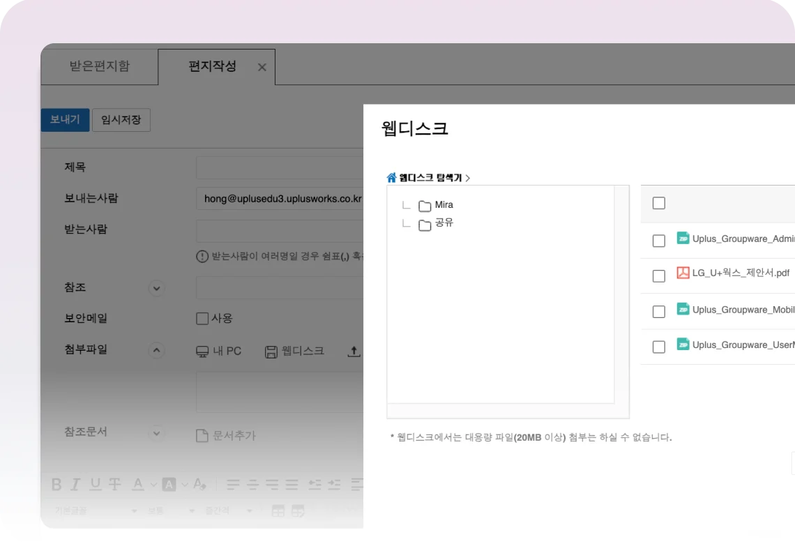 웹디스크 파일을 주요 메뉴에서 바로 첨부하여, 빠르고 편리하게 업무 효율을 높이세요.