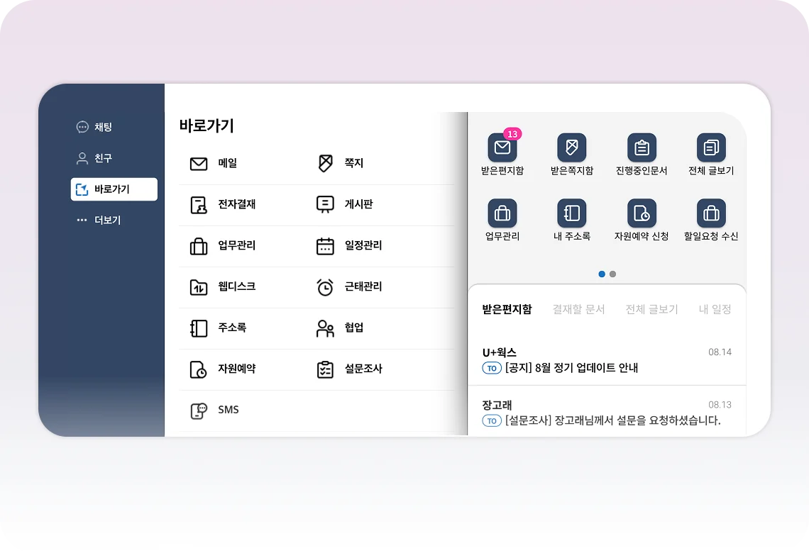 뉴스피드는 메일, 전자결재, 쪽지, 업무 요청 등 주요 알림을 실시간으로 모아 보여주며, 사용자는 모든 업무 요청을 빠르게 인지하고 즉시 대응할 수 있습니다.