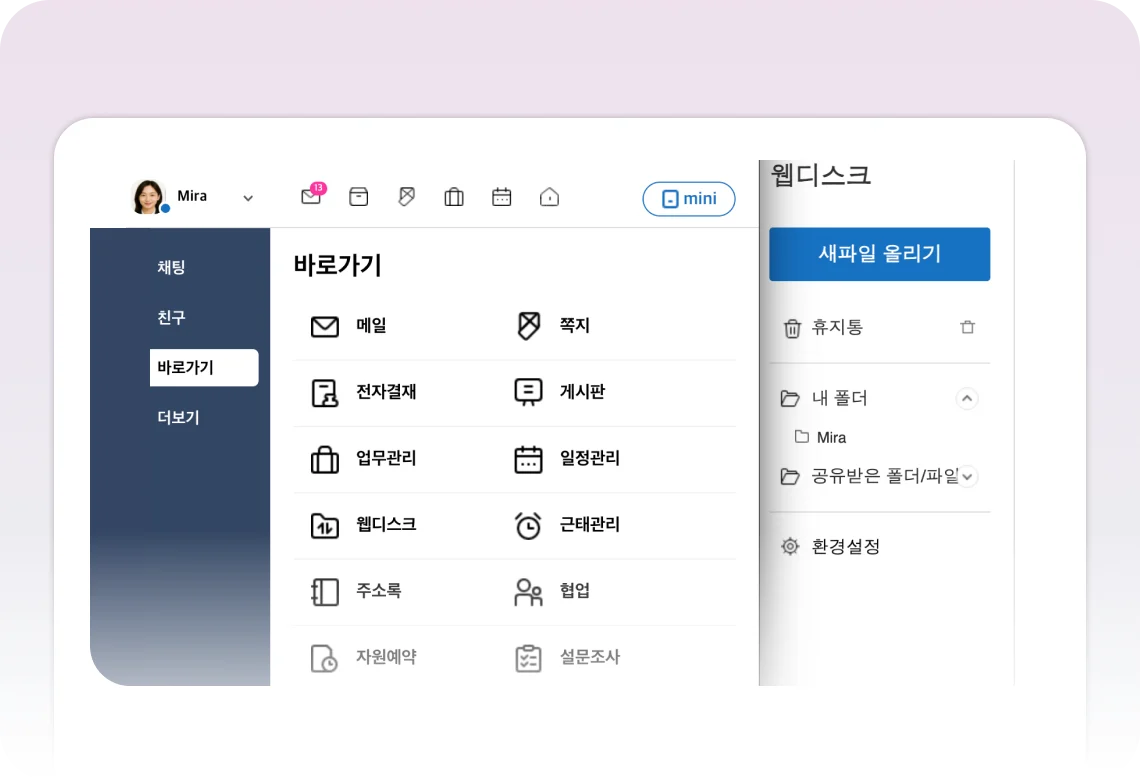 일반 파일은 물론, 웹하드에 저장된 대용량 파일, 캡처한 이미지까지 채팅창에서 바로 전송할 수 있어 자료 공유와 커뮤니케이션을 한 번에 처리할 수 있습니다.
