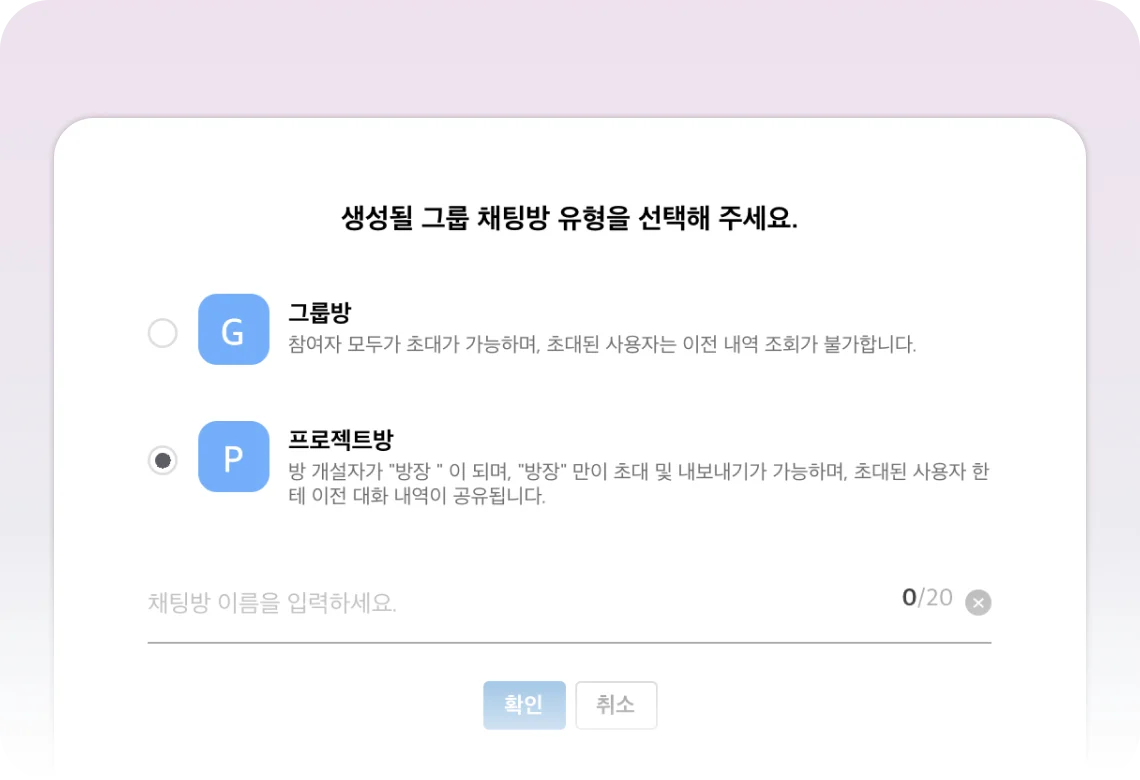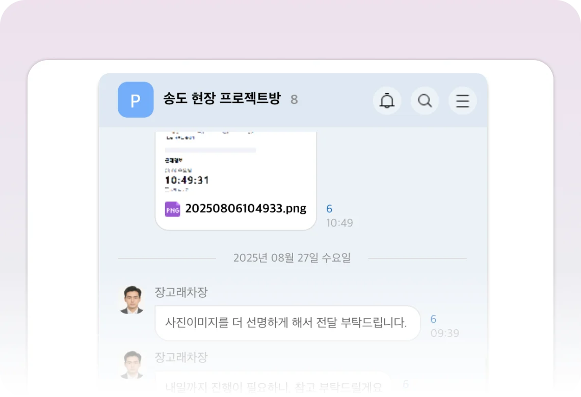 프로젝트방에서는 신규 멤버를 손쉽게 추가하고 이전 대화 내용을 그대로 공유할 수 있어 업무 맥락을 잃지 않고 업무를 이어갈 수 있습니다.