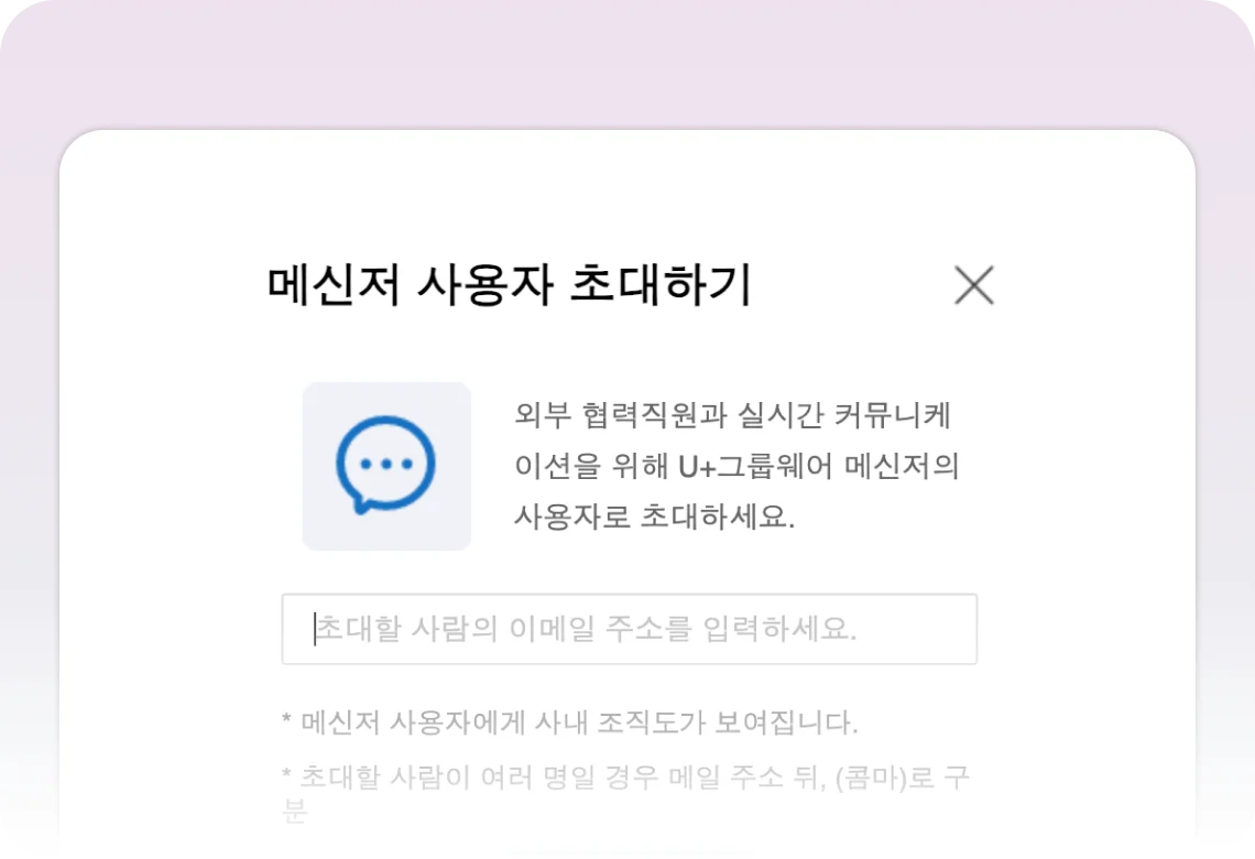 거래처, 협력사 등 외부 인원을 무료 메신저 전용 사용자로 초대·등록하여 내부 직원과 동일한 대화환경에서 협업할 수 있습니다.