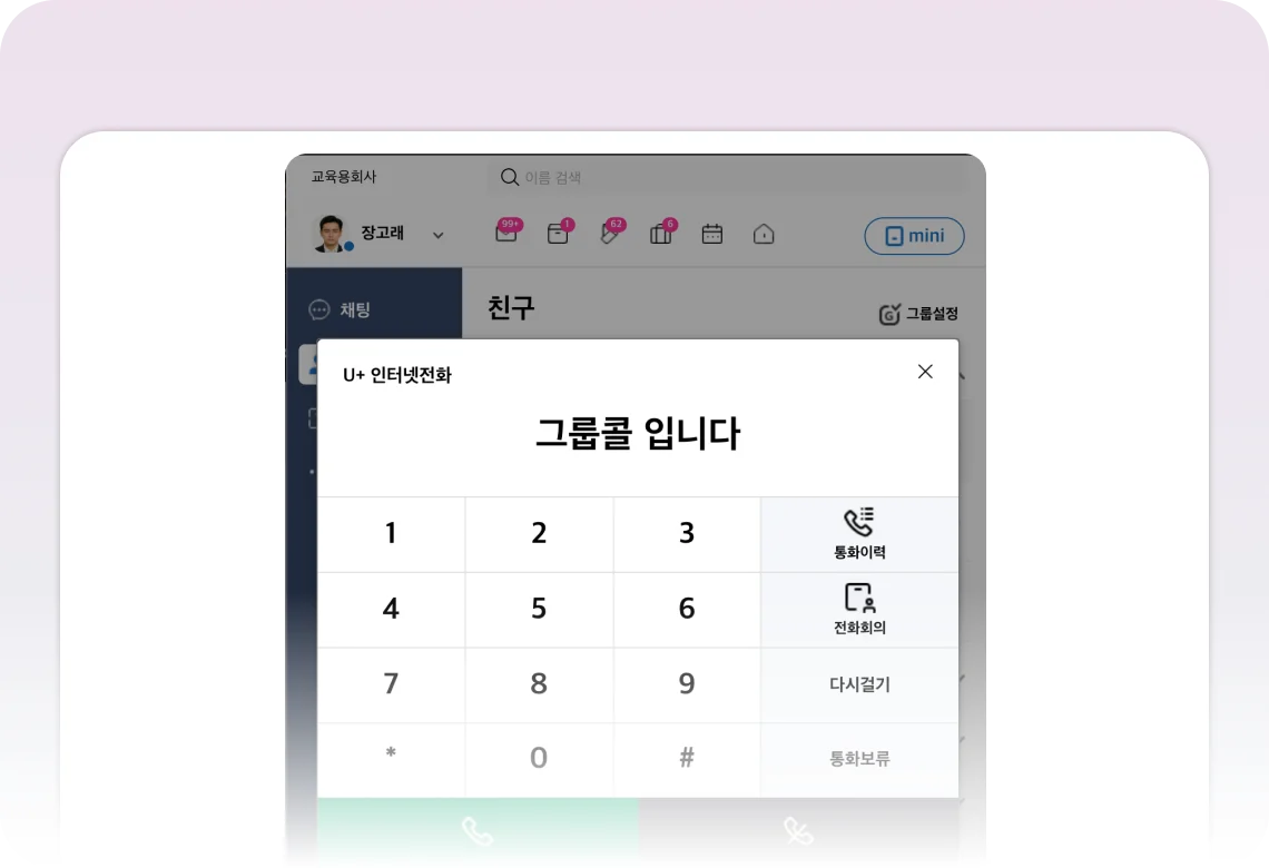 채팅방 참여자들과 즉시 그룹 통화(전화회의)가 가능하며,외부에서 걸려온 전화도 메신저 내에서 발신자 정보를 확인할 수 있어 유기적인 소통이 가능합니다.