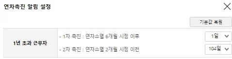 → U+웍스 팁: 기준일(회계연도/입사일)을 근무그룹으로 구분해 운영하면 알림·리포트 분리 관리가 편합니다.