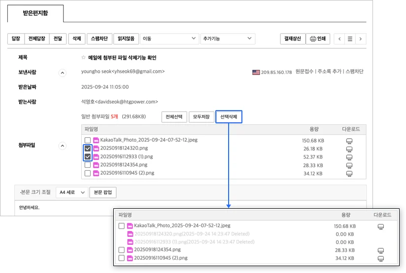 2. 수신 및 발신 메일에서 첨부파일 삭제 기능