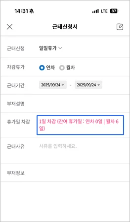 3. 모바일에서 근태신청 시, 잔여휴가 표시