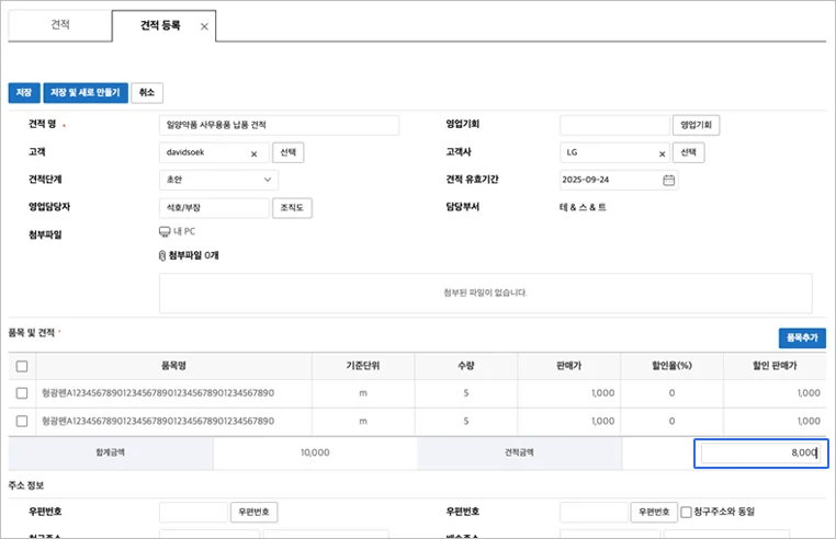4. 영업관리 견적등록에서 견적금액을 직접 입력토록 개선
