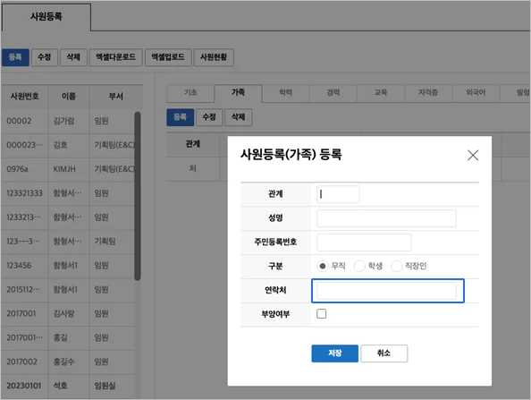 5. 인사관리 사원등록의 가족 탭에서 연락처 입력필드 추가
