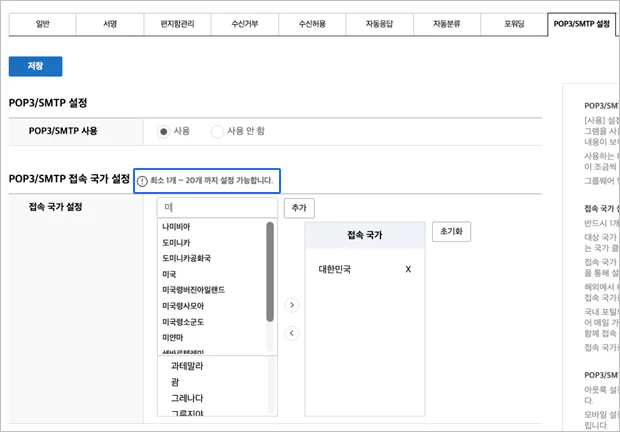 2. 메일 POP3/SMTP 접속 국가 설정의 검색기능 추가