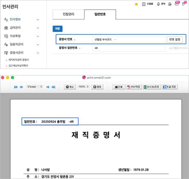 3. 인사관리 증명서 출력 시, 표시된 일련번호 설정