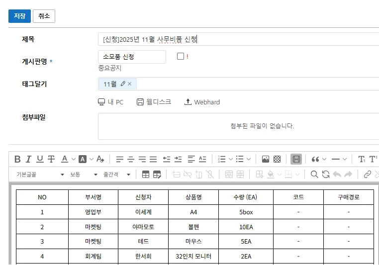 - ‘물품 구매는 게시판을 활용하고, 검수’ 전자결재 문서로 발주·검수·비용 집행까지 한 번에 흘려 보냅니다.