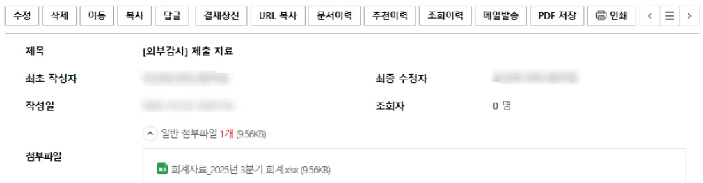 - 보안 필요한 문서는 전자결재에 첨부하고 열람권한/보안등급을 지정해 공유.