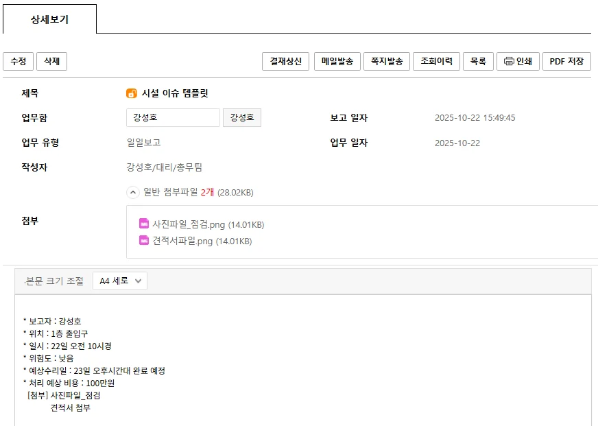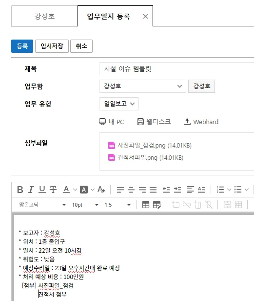 - 즉시 업무관리 > 업무일지(시설 이슈 템플릿) 열고, 사진·위치·시간·위험요소 기록.