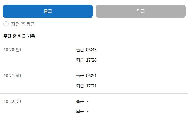 - 마지막으로 퇴근체크. 오늘도 흐름은 깔끔했습니다.