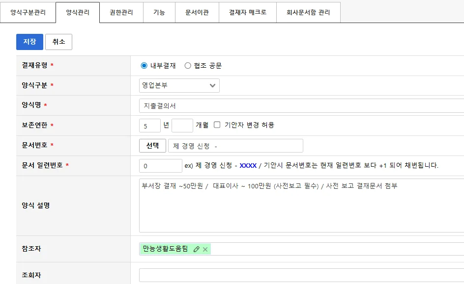 기안 양식을 직접 만들고 관리할 수 있다는 점입니다.