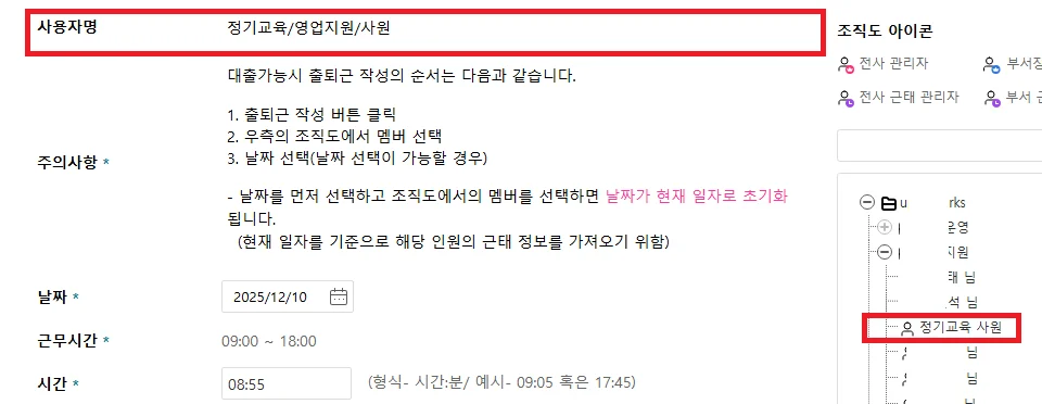 - 출근부를 누가 작성할지(개인/부서 담당자/전사 담당자)