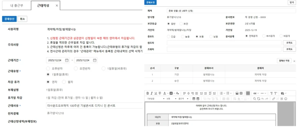 - 휴가·연차: 신청과 승인 모두 전자결재로 처리, 기록 자동 저장.
