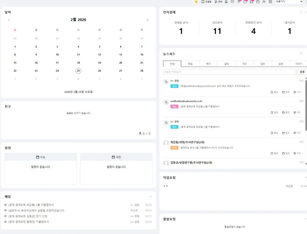 • 실시간 흐름 파악: 유플러스 웍스의 전자결재는 현재 누가 문서를 검토 중인지, 어디에서 멈춰 있는지 실시간으로 보여줍니다.