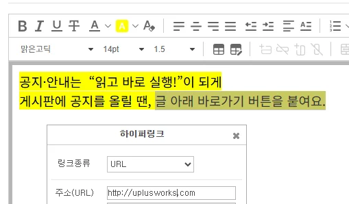 - 게시판에 공지를 올릴 땐, 글 아래 바로가기 하이퍼링크를 추가해보세요!