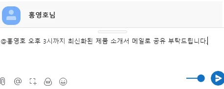 - [요청] 메신저에서 멘션 @홍영호님! “오후 3시까지 최신화된 제품 소개서 메일로 공유 부탁드립니다.”