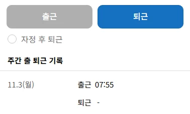- 그룹웨어 모바일 앱의 근태관리 메뉴에서 칼퇴근! 퇴근을 눌러요.
