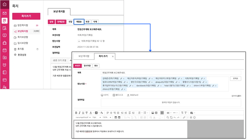 – 업무목적으로 사용할 경우 많은 수신자 대상 발송한 쪽지를 재발송 기능을 통해서 바로 발송 가능합니다.