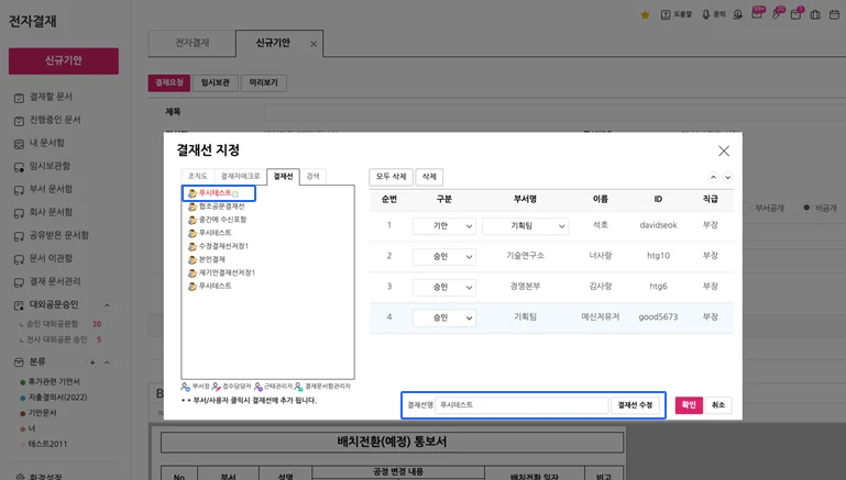 2. 기안작성 시, 결재선 팝업 창에서 결재선 삭제 및 수정 기능 제공