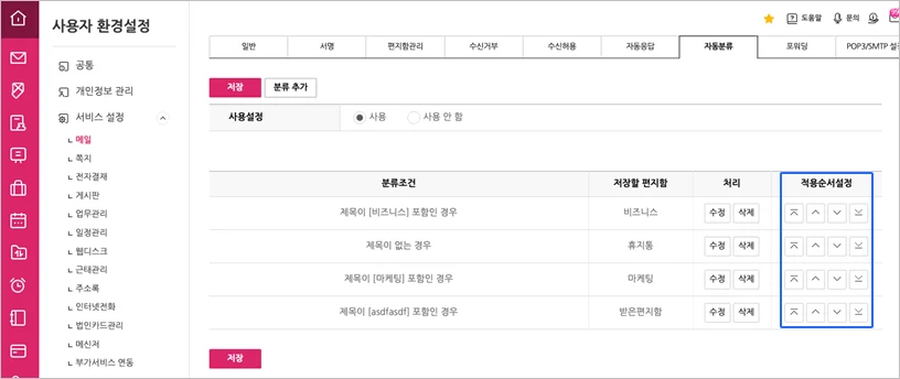 4. 메일 사용자 환경설정의 자동분류의 순서 설정 기능 개선