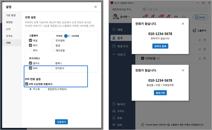 5. 메신저 인터넷 전화 연동 사용 시, 전화 수신 시, 발신자 정보 표시 팝업 기능 개선