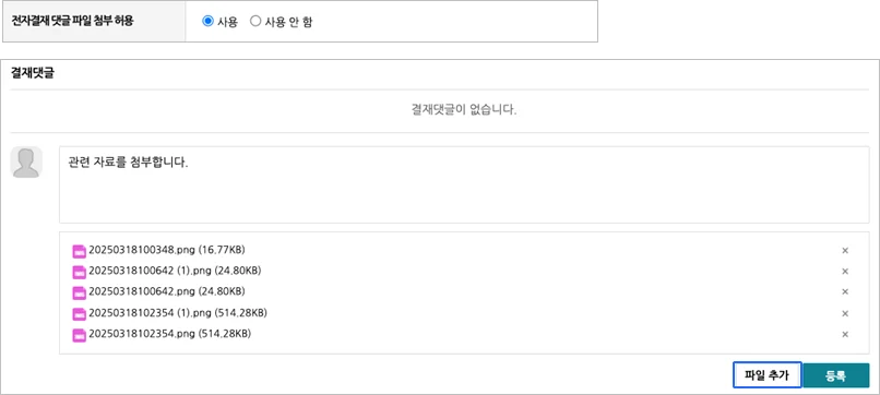 – 관리자 메뉴 > 전자결재 > 기능 : 사용으로 설정 하면 결재 댓글에서 파일 첨부 메뉴 표시