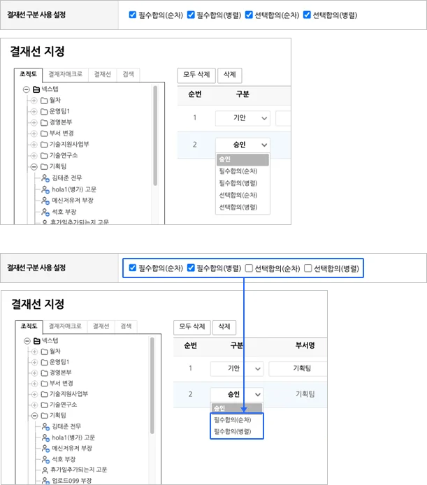 – 결재선 지정 시, 구분에 선택된 구분만 선택 가능
