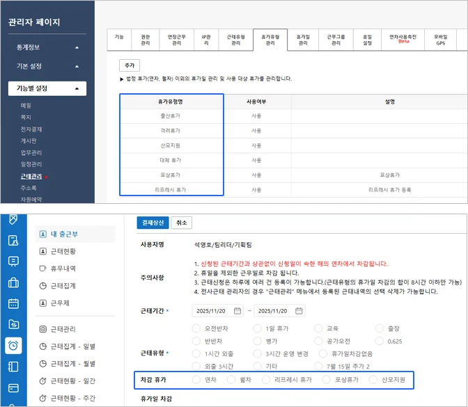 – 관리자에서 휴가 추가 및 근태 신청 시 차감휴가를 선택